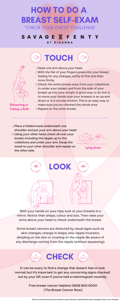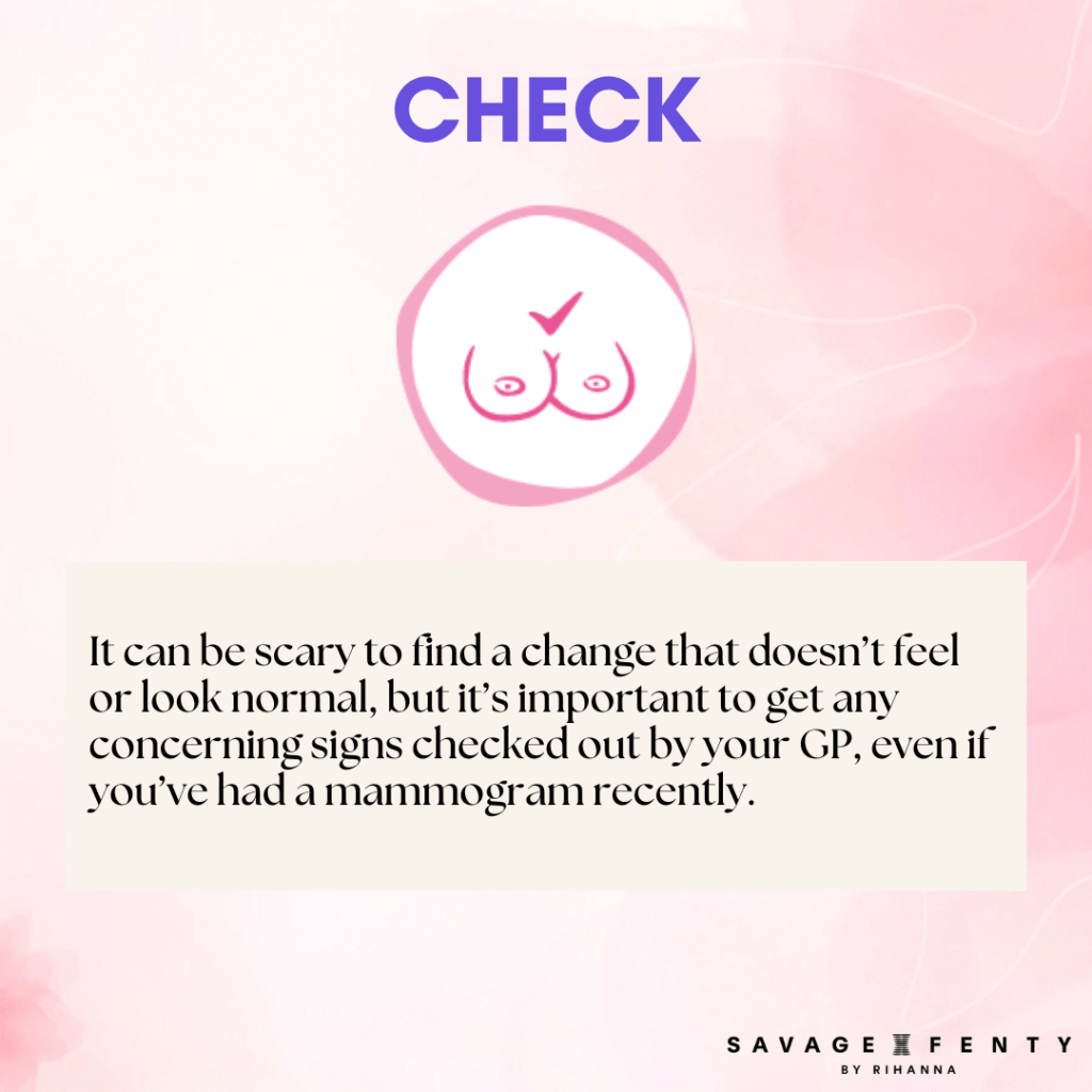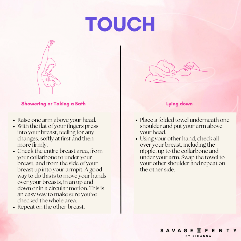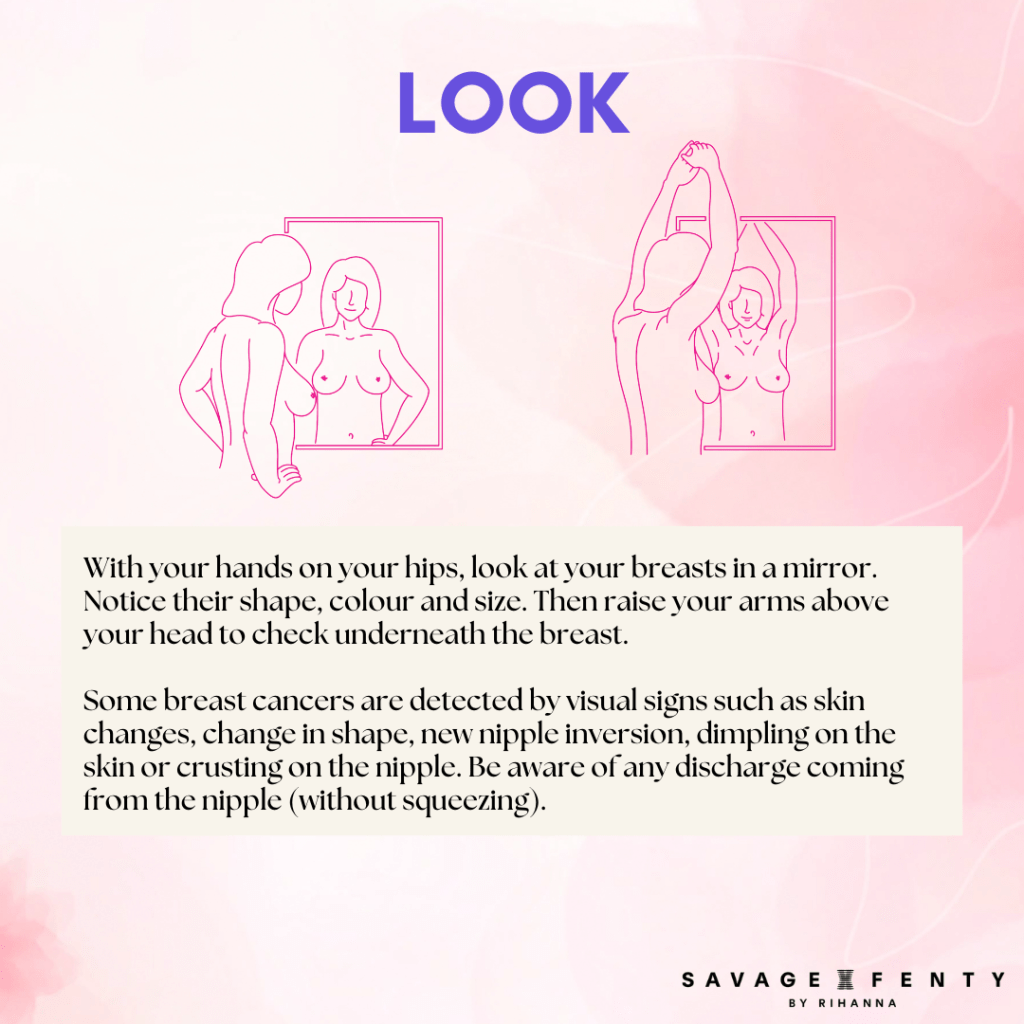 Performing a breast self-exam can be as easy as three words: Touch, Look, Check! Record your breast condition on our app once and month and win a special prize! #checkyourchest #PowerUpForBreastHealth #savagexfentyanniversary #breastcancer #breastcancerawareness #breasthealth