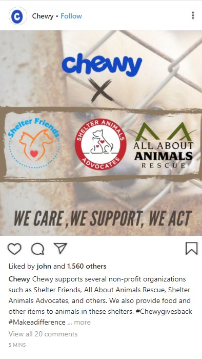 Chewy supports several non-profit organizations such as Shelter Friends, All About Animals Rescue, Shelter Animals Advocates, and others. Chewy provides food and other items to animals in these shelters.
