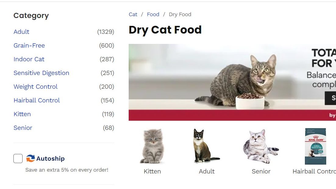 When selected, each category can be narrowed further by selecting a more specific sub-category, brands, life stage, breed, or material. The browsing experience becomes more user-friendly and productive.