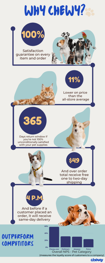 When it comes to customer service, we’re breaking records and raising the bar with around-the-clock access to our pet experts. We put customers’ needs first and Chewy shows this through our shipping rates, speed, and return policy.