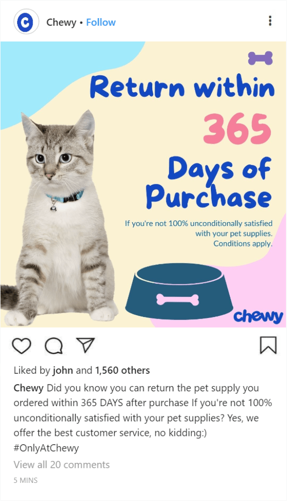 Our return policy is simple and worry-free: If you’re not 100% unconditionally satisfied with your pet supplies, you can return them within 365 days of purchase. Chewy will also refund the shipping price that was paid.